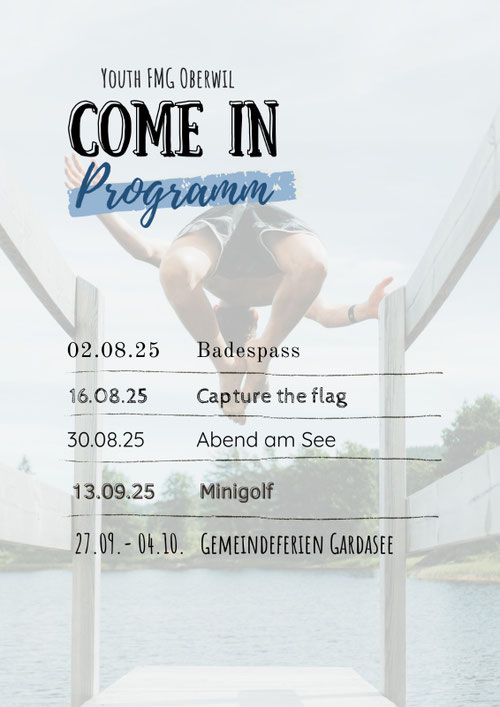 Möchtest du gerne coole Abende mit Gleichaltrigen erleben, Gott immer besser kennen lernen, spannende Themen diskutieren und zwischendurch auch mal einfach chillen? Dann bist du im Come in genau richtig! Hier treffen sich junge Erwachsene jeden zweiten Samstagabend. Action, Spass und Tiefgang garantiert - bist du dabei?